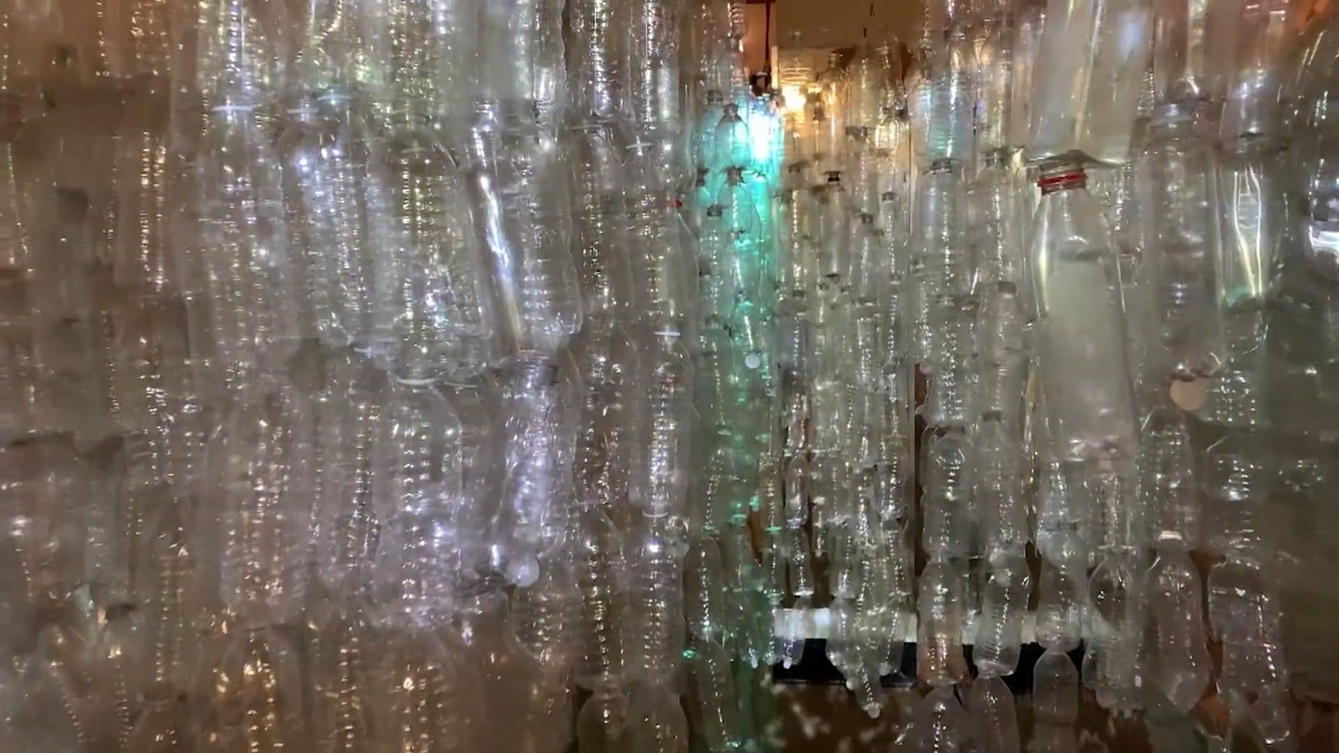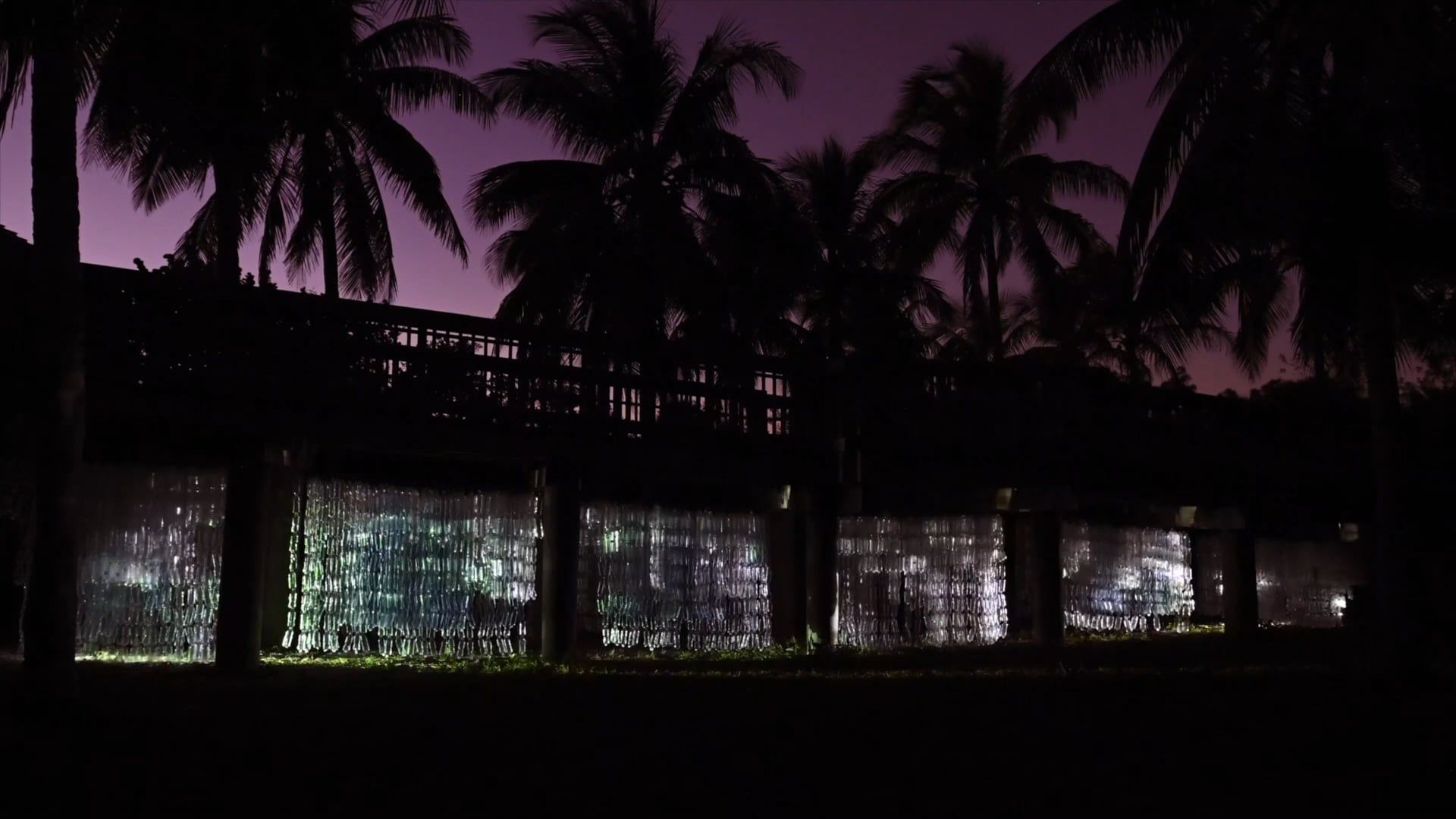 “Waterway” is a spatially transformable installation designed to be an immersive architectural experience informed by the glut of single-use plastic polluting our oceans. The piece is composed of thousands of collected suspended plastic bottles. Viewers traverse a pathway, submerged in a sonorous rattle and swaying brush of bottles that specifically invokes the irony of the very liquid containers that are polluting our water. Whether installed outside capturing dappled sunlight, or indoors or at night animated by projections of shimmering reflections of light on water, the installation gives the viewer a sense of being in the glittering beauty of the underwater environment, as if traveling through shifting currents of penetrating light and motion. Moving through the piece is a palpable, dynamic sense of the beauty of the ocean environment contrasted with a suffocating amount of plastic.